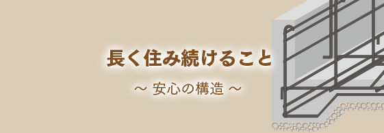 基礎は、建物の荷重を地盤に伝え、地震や台風による構造体の揺れを受け止めるという重要な構造体です。全ての建物について計画段階で地盤調査を行い、調査結果に応じた基礎を採用しています。標準では、鉄筋コンクリート造べた基礎となります。 立ち上がり部分には、上下に13ミリの主筋と補強筋を配筋することで充分な強度を確保しています。また、基礎幅を150ミリ( 一般的には120ミリ)とすることによって、鉄筋のかぶり厚を確保し、耐久性も向上しました。