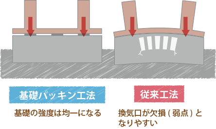 床下換気には、基礎パッキンによる「ねこ土台」を採用しております。従来のように換気口部分の欠損がないため強度が均一になります。