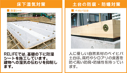 水分のある場所には腐朽菌やシロアリが発生しやすいため、住まいの耐久性を高めるためには、湿気の対策がかかせません。RELIFE(リライフ)では、床下からの湿気を遮る防湿対策と、高い防腐・防蟻を持つヒノキを土台・大引として使用しています。長く快適に、且つ住む人にも優しい住まいを実現しています。