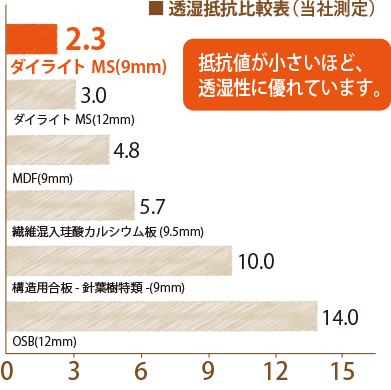外壁の内部結露を防ぐには、湿気をよく通す耐力面材を使用することが大切です。ダイライトMSは、透湿抵抗値が9mm厚で2.3ですから、構造用合板の約5倍の浸透性を発揮し、壁内の湿気を速やかに放出し、結露を防ぎます。