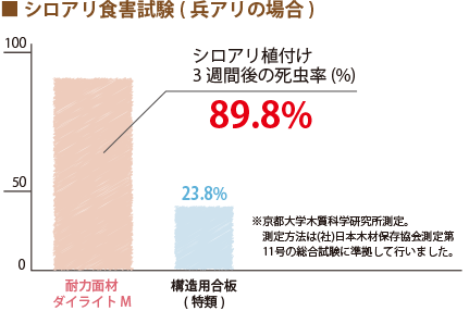 数々の耐候試験でもすぐれた耐久性を実証したダイライトは、常に安定した品質を保ちます。 シロアリが食料とする成分を含んでいない無機質素材ですから、6ヶ月間土中に埋める実験でも、ほとんど変化がありませんでした。それだけ防蟻性に優れた耐力壁なのです。しかも、結露しにくい素材ですから、住まいは丈夫で長持ち。木造住宅耐用年数向上に役立ちます。